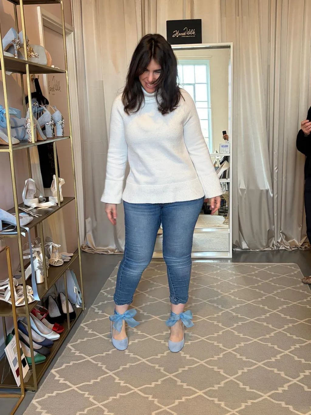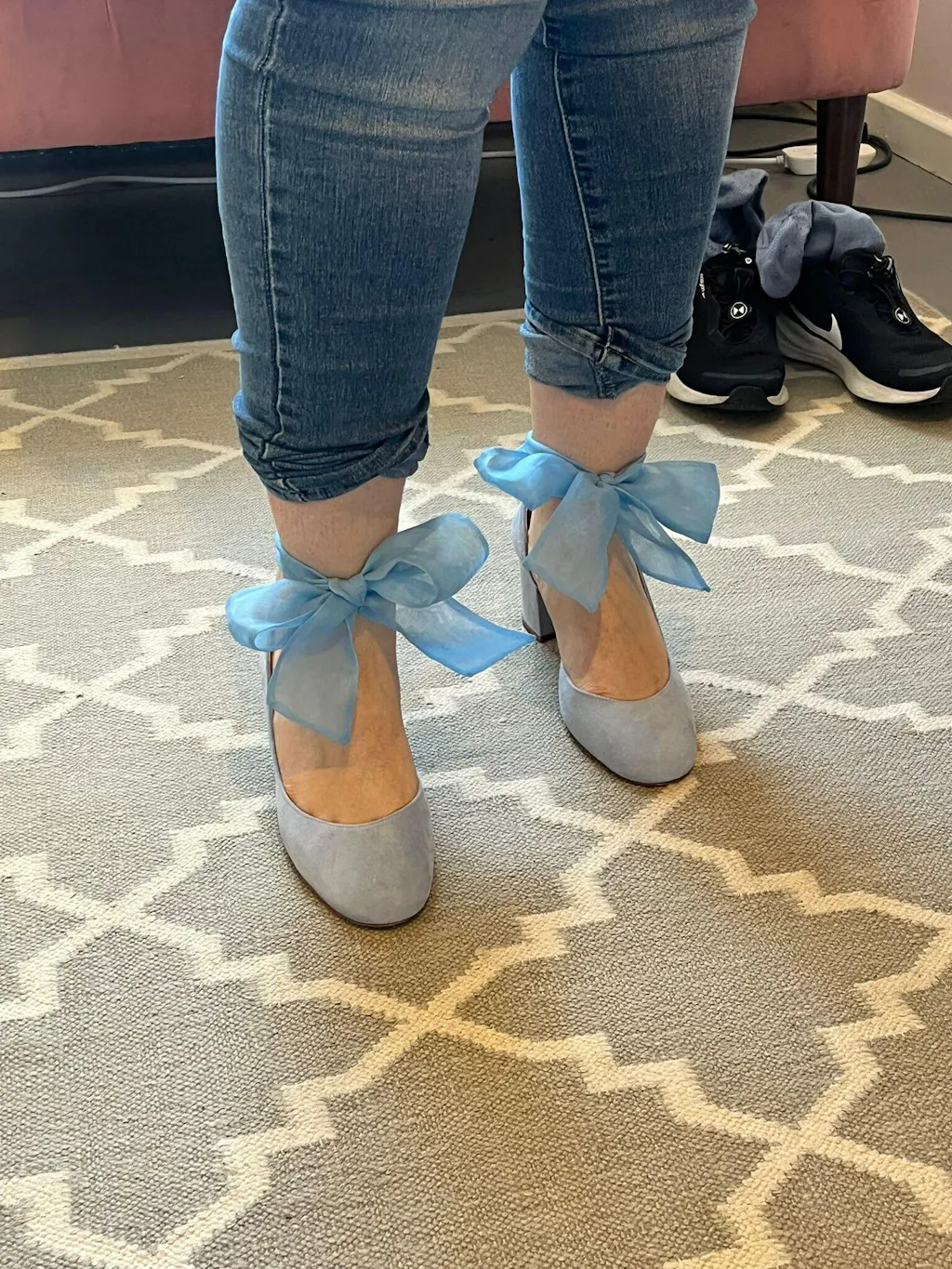 A comfortable mid block heeled blue wedding shoe, crafted in Spain using misty blue suede with a full leather lining, padding under the foot and a leather sole, all natural and high quality. Order the style with the organza bows or with both organza and ankle straps, they are easy to change over and it gives you 2 looks with one shoe, both secure the shoe to the foot. The heel is approximately 6cm, 2.5 inches high, this is a stable, supportive and comfortable style. If you would like a custom embellished style, please select the Hetty Mid Blue Organza Custom Embellished style. If you would like a sole message this can be added, you can still return and exchange the shoes.