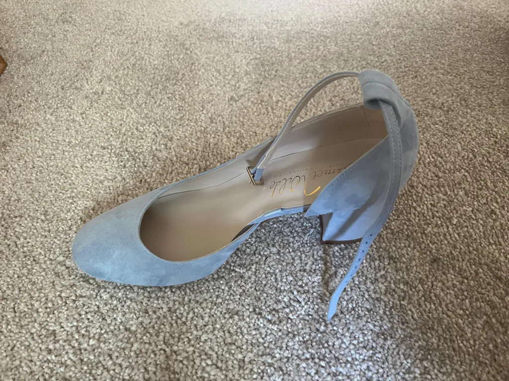 A comfortable mid block heeled blue wedding shoe, crafted in Spain using misty blue suede with a full leather lining, padding under the foot and a leather sole, all natural and high quality. Order the style with the organza bows or with both organza and ankle straps, they are easy to change over and it gives you 2 looks with one shoe, both secure the shoe to the foot. The heel is approximately 6cm, 2.5 inches high, this is a stable, supportive and comfortable style. If you would like a custom embellished style, please select the Hetty Mid Blue Organza Custom Embellished style. If you would like a sole message this can be added, you can still return and exchange the shoes.